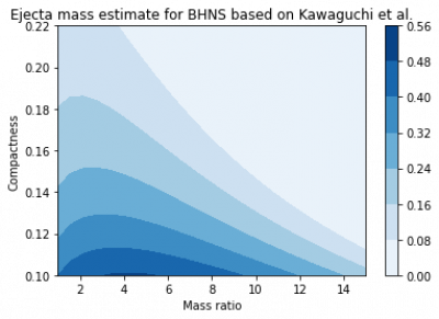 Within this code, we compute the ejecta mass based on the work of Kawaguchi el al. 2016 for various mass ratios and neutron star compactnesses, as shown in the plot below.